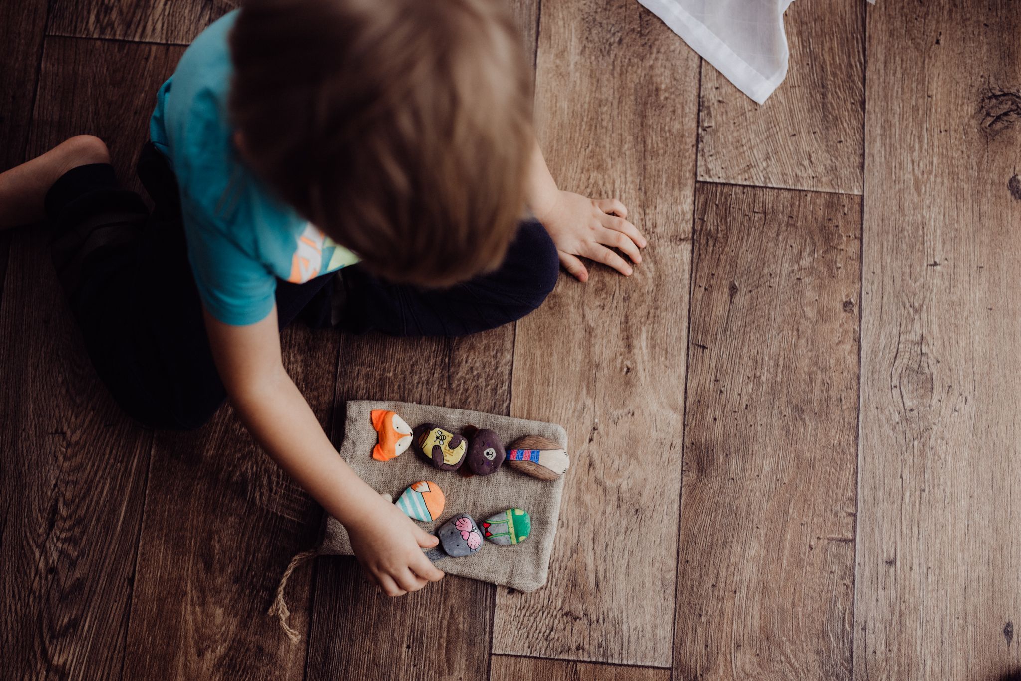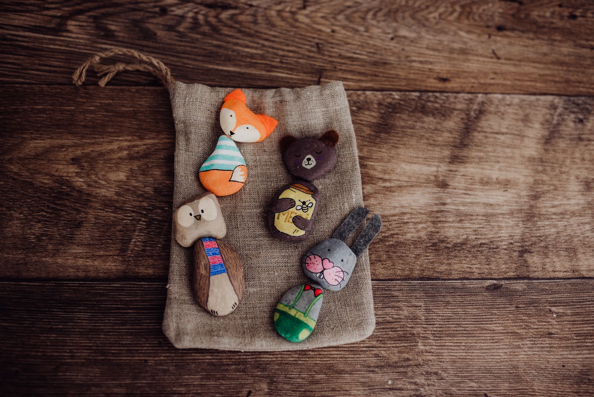 Käsitsi kividele joonistatud pusle koos  100% linasest riidest kotiga.